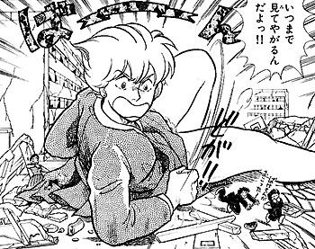 破壊の限りを尽くす巨大女子高生。粉味氏の勢いのあるキャラクターが、まさに威力倍増、いや魅力倍増。文句なしです。やりたいほーだいやってしまっては犯罪ですが、そこは宇宙人に操られてのこと。しかたありません。市民のみなさんも納得してくれるでしょう。それに地球を宇宙人の手から守ってくれたのだから、少々街が壊されたくらいでおこる人もいないでしょう。なんてね。