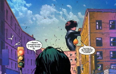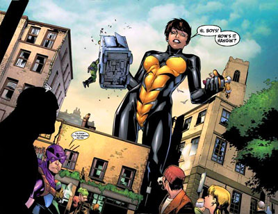 明くる日、交通事故を処理するシーハルクの目に巨大なワスプが映った。ビルよりも背が高い彼女の姿は、街のどこにいても見ることができるのだ。そしてそれは、そこで事件が発生していることを意味していた。到着したレスキュー隊に事故処理を任せると、シーハルクはワスプを目印に事件現場に向かった。